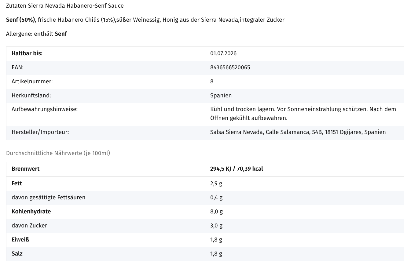 <p><strong>Senf (50%), </strong>Habanero-Chili (15%), Honig, Weinessig, brauner Zucker, Apfelessig, Zitronensaft, Salz</p><p><strong>Allergene: enthält Senf</strong></p>